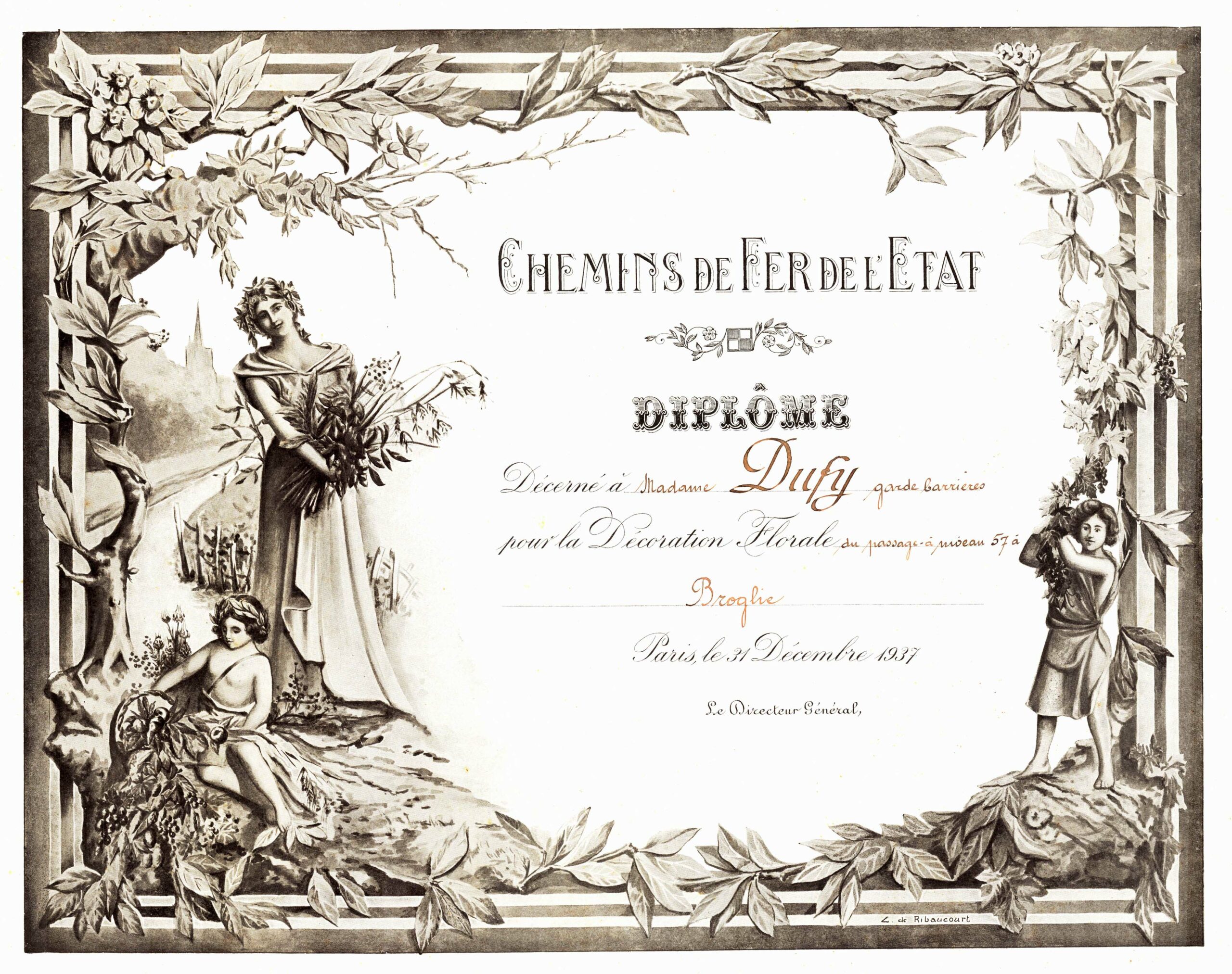 Diplôme pour décoration florale de Madame DUFY garde barrière du passage à niveau 57 - 31 Décembre 1937